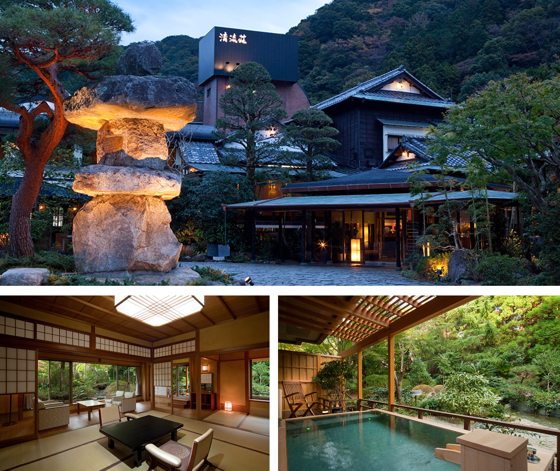 凛とした意匠の貴賓室は「貴賓」の名に恥じないゆとりある空間と気品を大切にしており、自然が語りかける露天風呂付客室で、思う存分源泉掛け流しの名湯をご堪能いただけます。