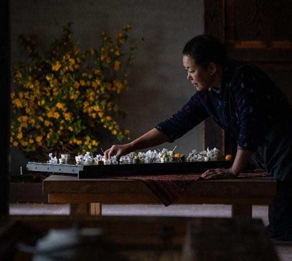1日1組限定の名店「羅漢」の加藤敦子氏が車内で心を込めて腕を振るいます。移ろう季節を表現した絵画のような盛り付けと、こだわり抜いた味覚をお楽しみください。