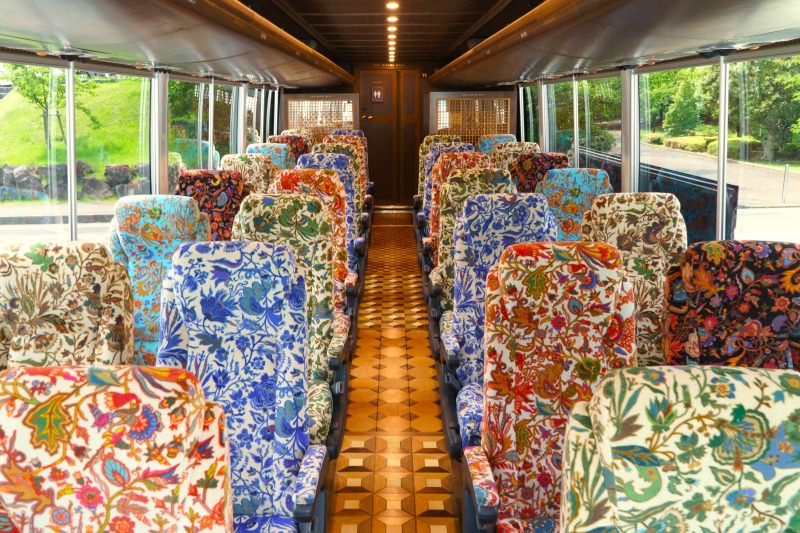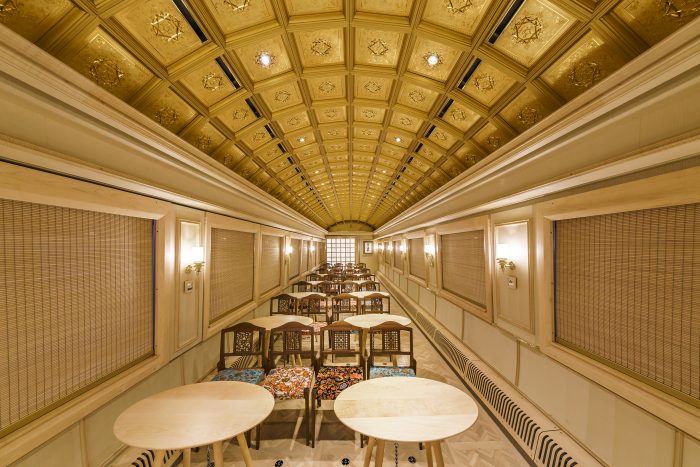 特殊技術の「電気鋳造」で製作した黄金のパネルを、世界で初めて天井に配した特別な車両。美しく煌びやかな金の格天井に囲まれたマルチカーでは、季節に応じてさまざまな企画をお楽しみいただけます。